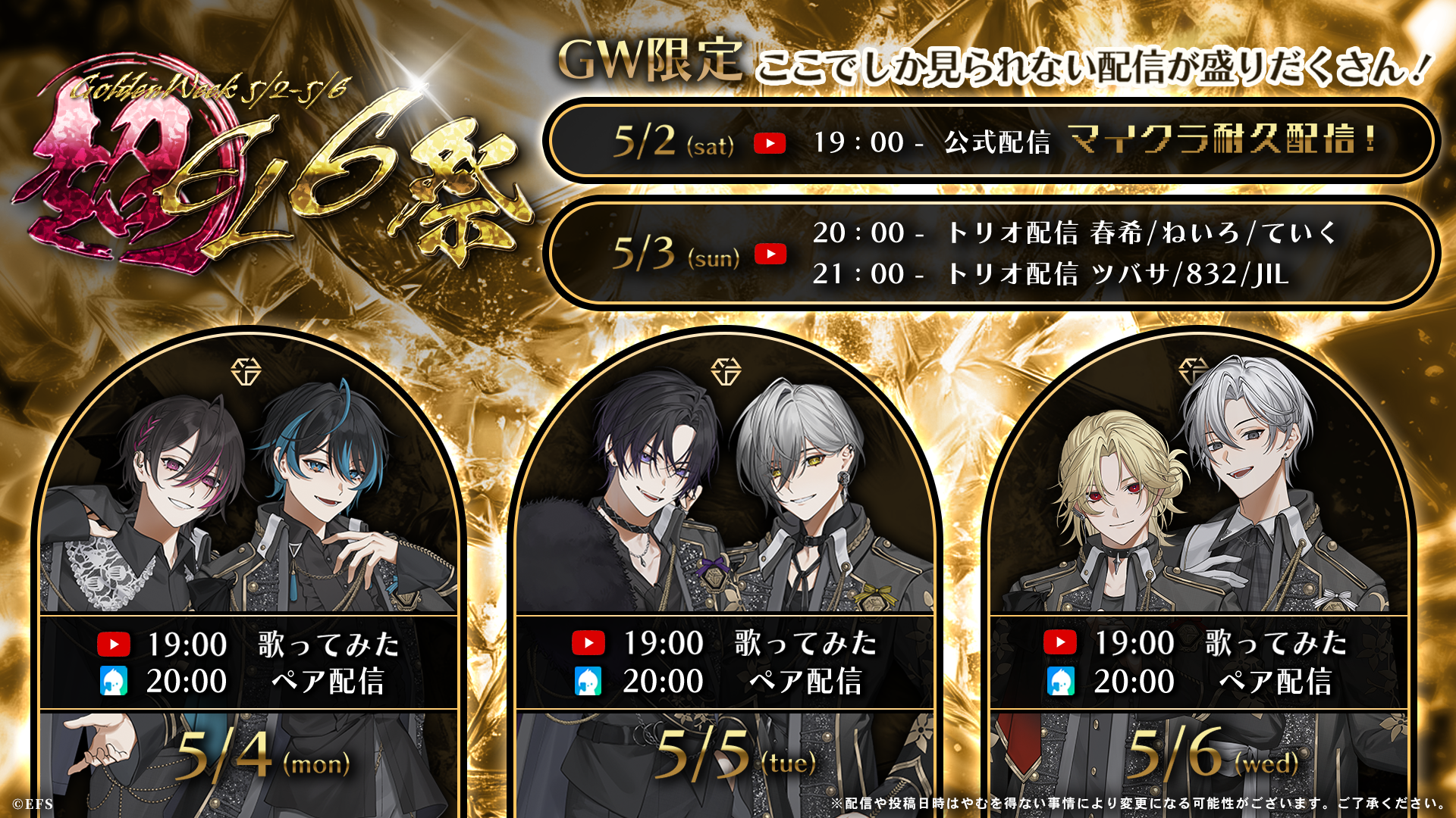 5/2-5/6 は 【GW限定企画】が盛りだくさん🌸 毎日配信&特別ペアの歌ってみたをお届け! 最高のGWをElement Sicksと一緒に💎