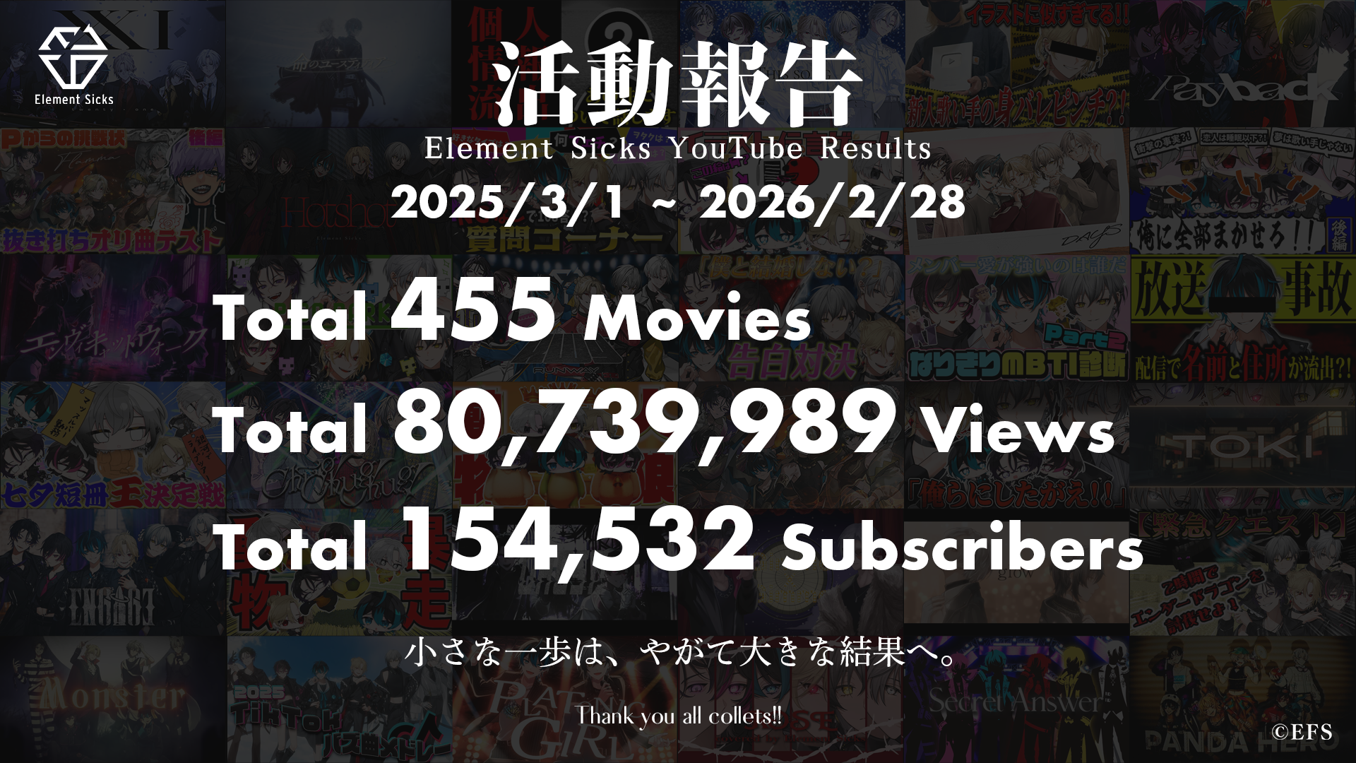 1年をかけて、みんなと作ってきた記録です。 この数字のすべてが Element Sicksの歴史になりました。